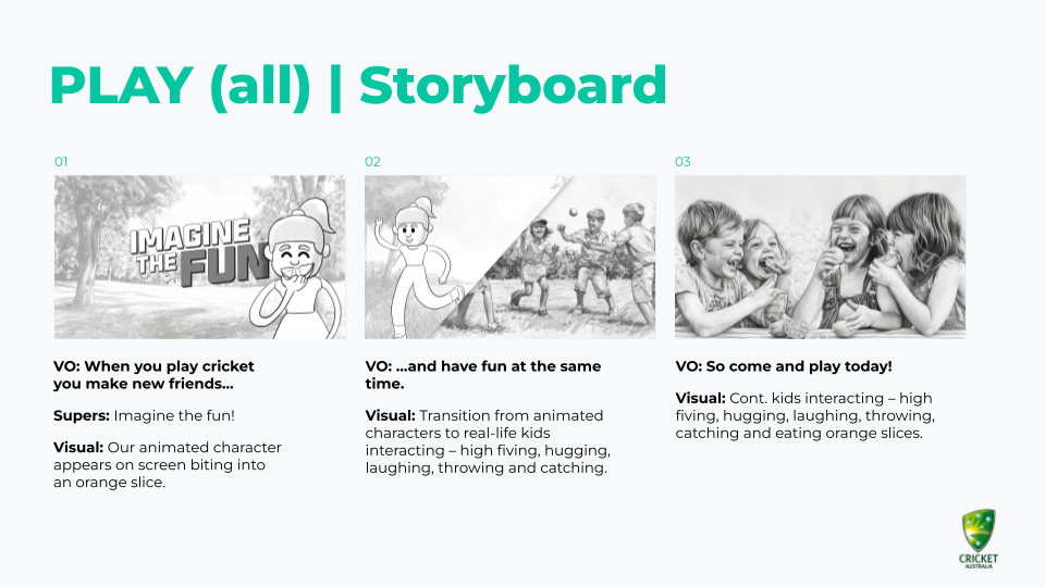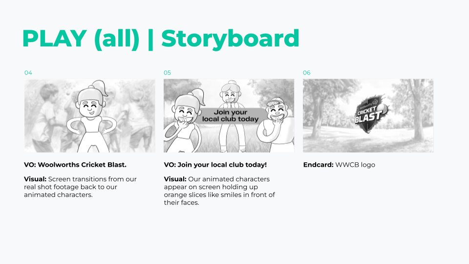 Following the success of the 2023 ‘Imagine the fun’ campaign for Cricket Australia Woolworths Cricket Blast (WWCB) program, this year we were tasked to create 6 x 15” TVC’s spots that continued to show the fun and fast-paced nature of both the WWCB and Junior Cricket programs that Cricket Australia have to offer. Each video was specifically created to showcase the 3 messaging pillars of ‘PLAY, LEARN & GROW’ across both WWCB and Junior Cricket. Using a first person POV perspective, we invited the viewer to come and experience the cricket programs first-hand as though they’re in the thick of the action. Watch the 15” spots and experience the thrill of cricket for yourself!